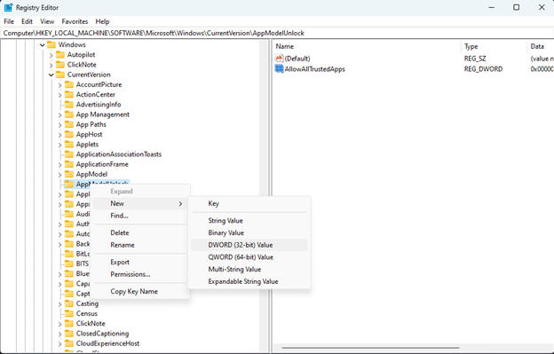 STEP 4e: Right click on AppModelUnlock folder and select New -> DWORD (32-Bit) Value