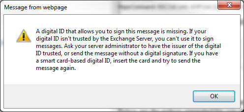 Problem 26: Receiving following message in OWA when trying to open an encrypted email message: "This message can't be decrypted. If you have a smart card-based digital ID, insert the card and try to open the message again."