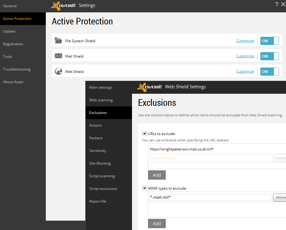 -You can also manually add an exception for each website you are having problems accessing by selecting the Protection option (on the left), then select ONLINE THREAT PREVENTION, followed by exceptions. From here manually type in the webmail server addresse(s).