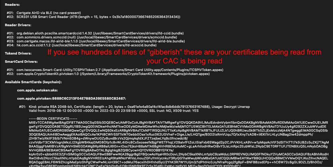If you see hundreds of lines of "gibberish" these are your certificates being read from your CAC.